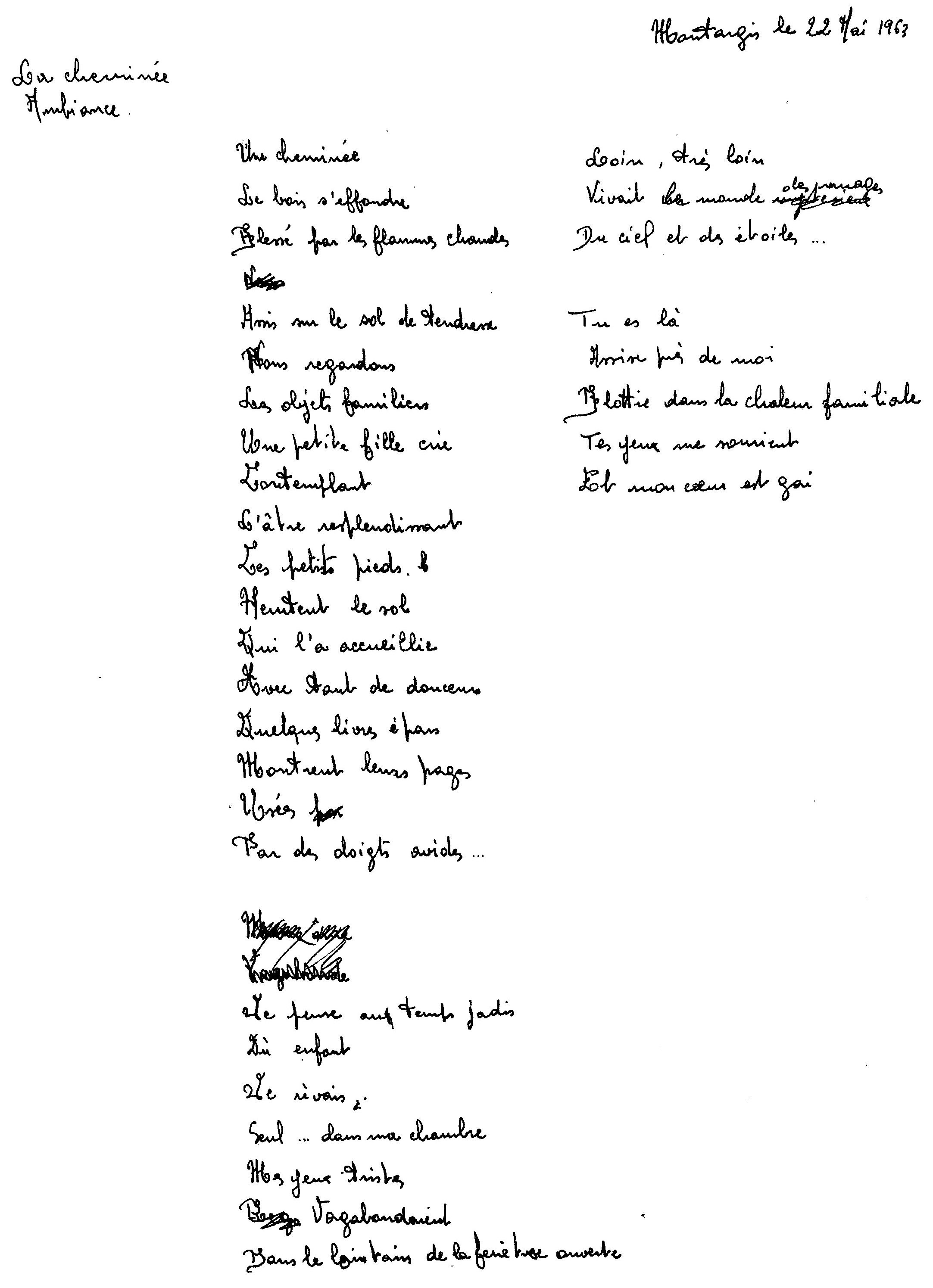Une cheminéeLe bois s’effondreBlessé par les flammes chaudesAssis sur le sol de tendresseNous regardonsLes objets familiersUne petite fille crieContemplantL’âtre resplendissantLes petits piedsHeurtent le solQui l’a accueillieAvec tant de douceurQuelques livres éparsMontrent leurs pagesUséesPar des doigts avides…Je pense au temps jadisOù enfantJe rêvais,Seul… dans ma chambreMes yeux tristesVagabondaientDans le lointain de la fenêtre ouverteLoin, très loinVivait le monde des nuagesDu ciel et des étoiles…Tu es làAssise près de moiBlottie dans la chaleur familialeTes yeux me sourientEt mon cœur est gai